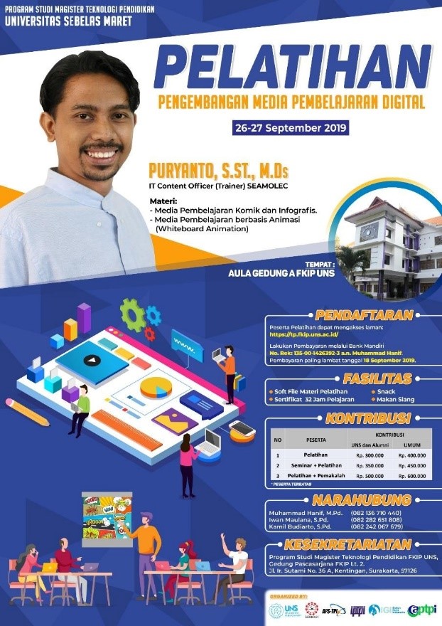 Selain webinar tersebut, S2 Teknologi Pendidikan Universitas Sebelas Maret (UNS) Surakarta juga mengadakan kegiatan Pelatihan Pengembangan Media Pembelajaran Digital yang dilaksanakan pada 26-27 September 2019 di Aula Gedung A FKIP UNS.
